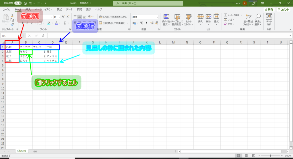 1⃣表の見出しである先頭行先頭列を決めて、見出しの枠に囲まれた内容の最左上のセルを選択する