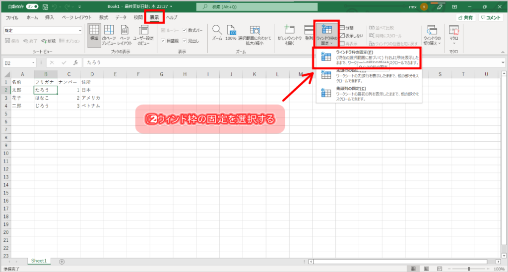 2⃣メニューバーの「表示」を選択し「ウィンド枠の固定」をクリックし中から「ウィンド枠の固定」を選択する