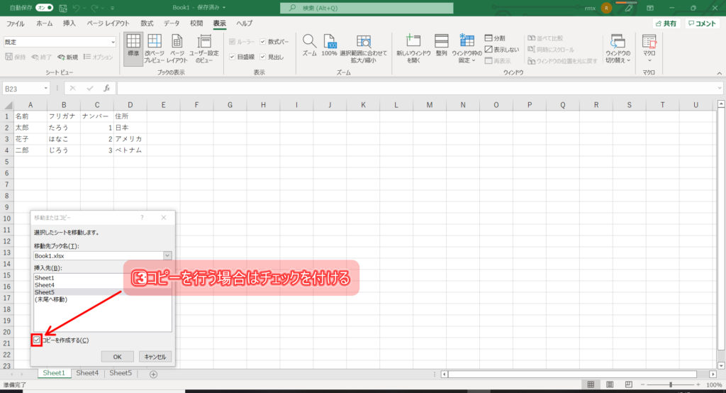 3⃣コピーを行う場合には「コピーを作成する」のチェックを付けてからOKを押す