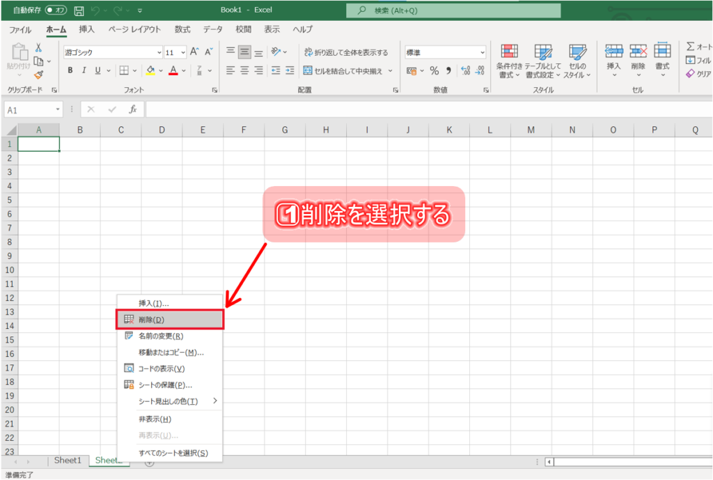 1⃣削除したいシートの見出しを右クリックし、「削除」を選択する