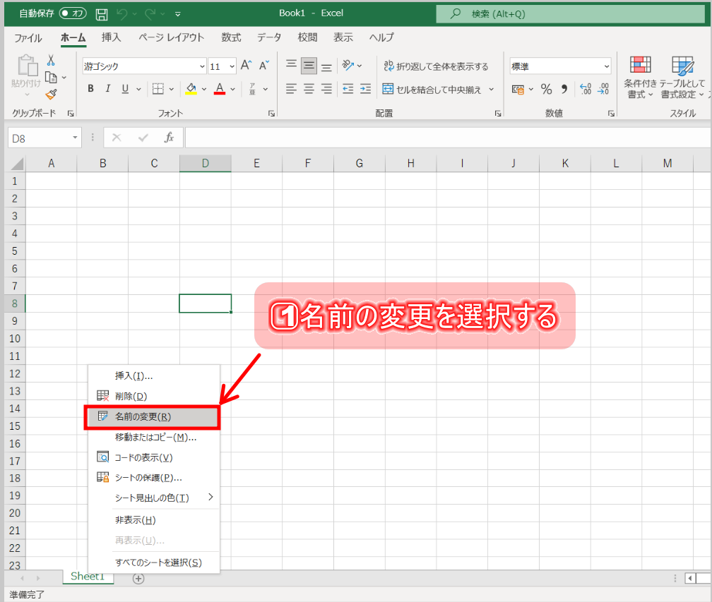 1⃣名前変更したいシートの見出しを右クリックし、「名前の変更」を選択する。或いはシートをダブルクリックする