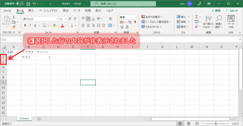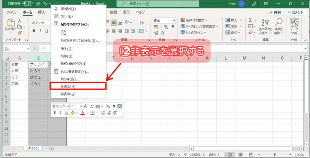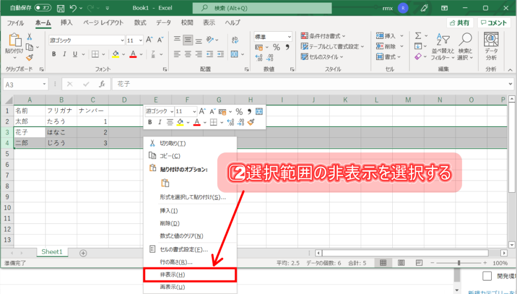2⃣選択範囲右クリックし、「非表示」を選択する