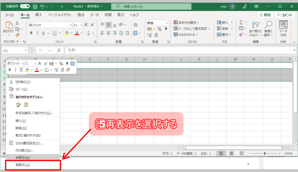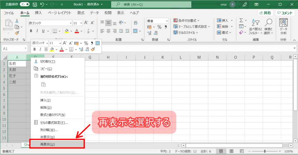 5⃣ 選択範囲右クリックし、「再表示」を選択する