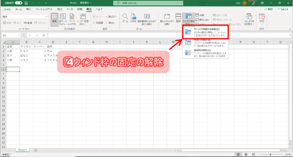 4⃣「ウィンド枠の固定の解除」は 「ウィンド枠の固定 」と同じ所をクリックしてください。