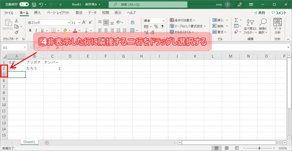 4⃣非表示の行或いは列隣接する二行(列)ドラッグし選択する。